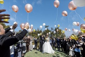快晴の中でのバルーンリリース 空高く上がるバルーンを見届け、